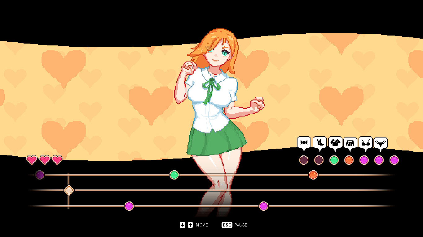 Just a little rhythm game. Dodge the arrows, collect colored dots in correct order, watch the clothes disappear. Thats it. Controls : W / UP - move up S /DOWN - move down ESC - pause Enjoy.