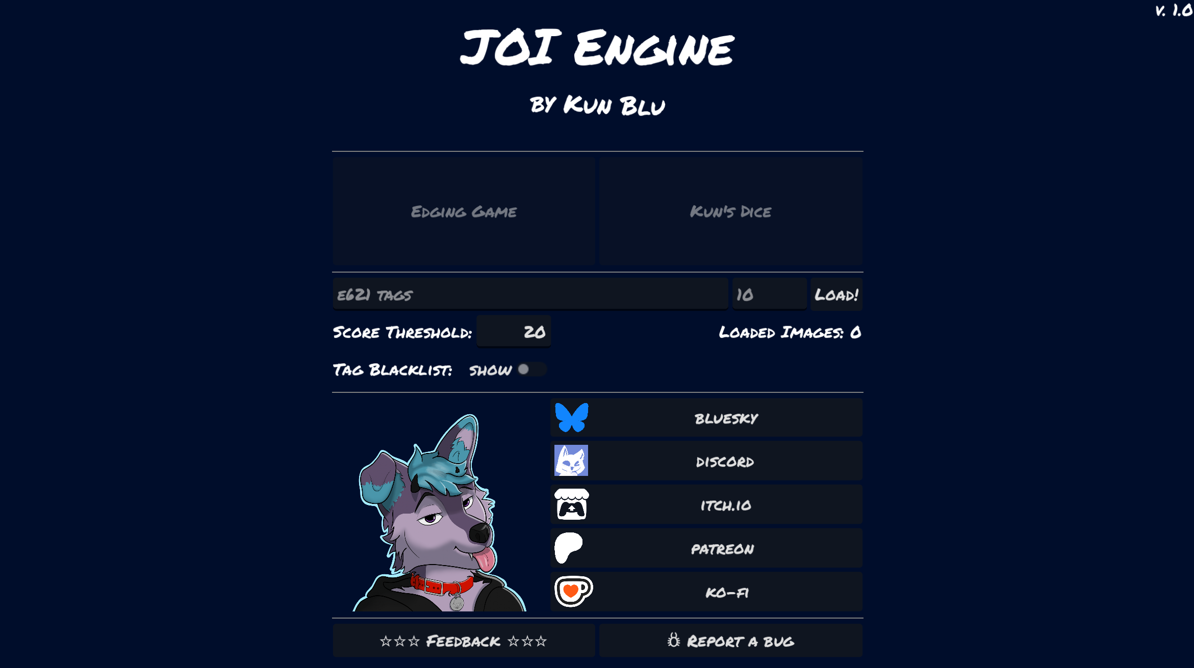 Hi I'm Kun Blu! I'm a furry game design student with naughty interests >:3 and I made JOI Engine ^w^ JOI Engine is a game that tells you how to jerk-off (sorry for the bluntness uwu). The game takes your query and downloads images from the e621.net and right now you can choose 2 game-modes! Edging Game -> You're gonna get a tempo (a beat) to which you can stroke or do any task you want. If you're lucky you'll be able to finish >:3 Kun's Dice -> Roulette game where you get random task and random...
