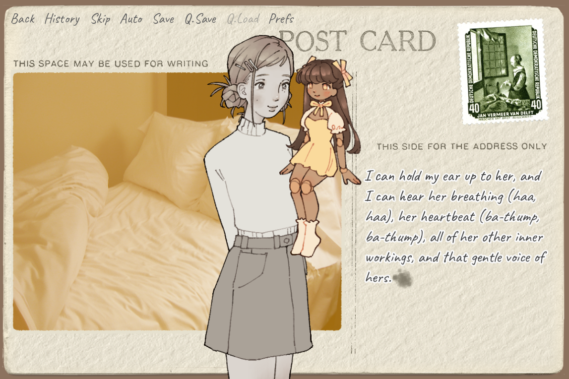Deirdre cradles her doll, and the doll within her. Kenzie is on her way to meet the girl she knows. Beloved Marmite is always there for you. 21k words. This kinetic visual novel contains sexual content and is intended for grown-ups only and is not suited for kids under the age of 18. Made for the DOLL & KIGU JAM Writing by KillJill , art by PPilotco