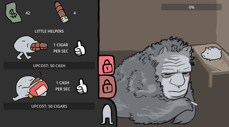 Created for BaraJam2025!! This strange cat with a human face seems to have an interest in cigars. Give him some. Collect money and pay little creatures to collects cigars for you in order unlock shtuff. This is my first ever game that I've programmed! All art and code was created by ME (ghoul.time). Thank you to the creators of tutorials and to anyone I've reached out to in order to understand how to code certain mechanics.